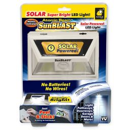 Official as seen on tv atomic beam sunblast by bulbhead solar powered led motion activated security light industrial strength adhesive for easy installation atomic beam sunblast 1 pack 3 3 out of 5 stars 282.